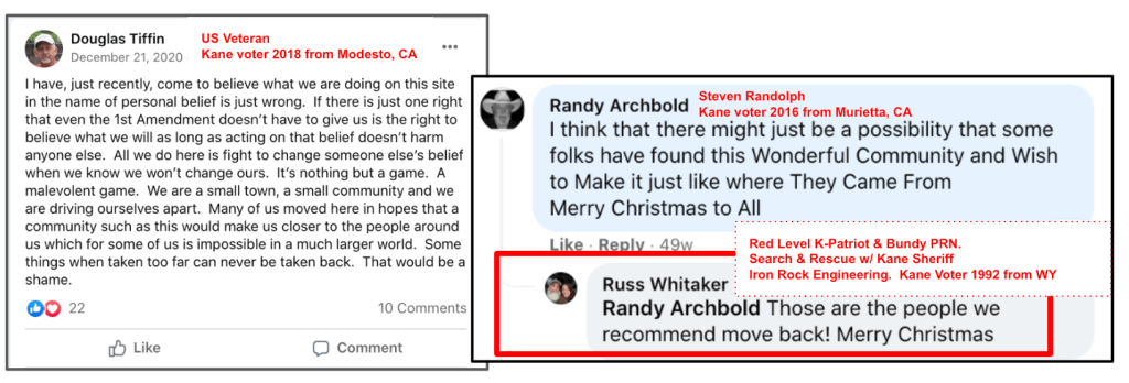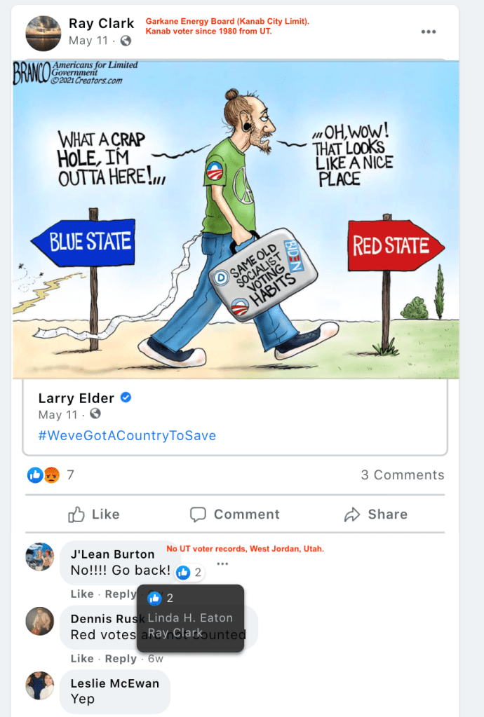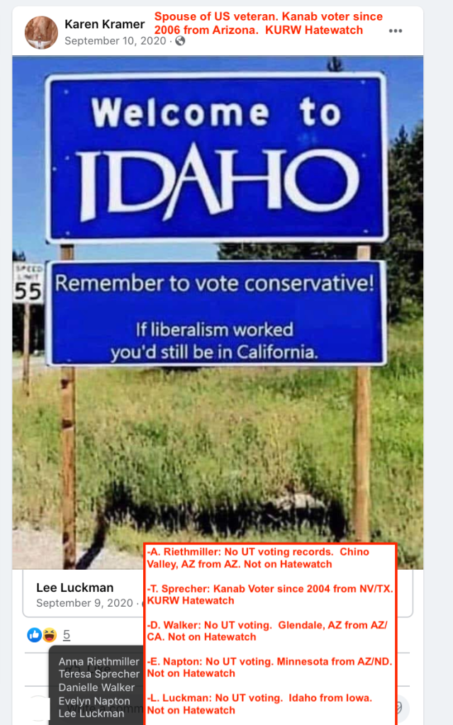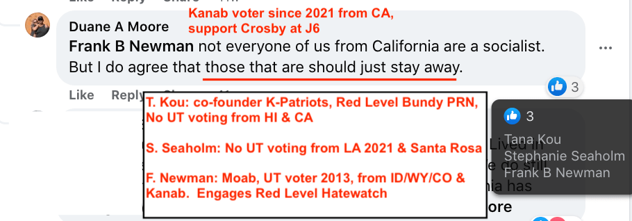Vote Red in Idaho or stay in California shared from an Idaho resident by a Utah resident, Karen Kramer, who is from Arizona with no record of residence in California or Idaho. Her spouse is a US veteran who supported the Jan 6 attack on the US Capitol. The one supporter, Teresa Sprecher, in Kanab who liked this bigotry has no record of residence in California either. Sprecher’s spouse also supported Jan 6 Trump & The Storm conspiracy and his father is a veteran. Only one of the respondents had a residence in California.