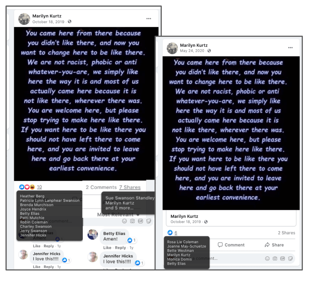 Marilyn Kurtz supported DeMello’s fear of liberals voting to change Kanab and posted this extensive intolerance of move-ins, twice. Kurz is the spouse of US Veteran & mother-in-law of KPD Sgt. Darrin Coleman. She is a Kanab Patriot & supporter of Ammon Bundy’s People’s Rights Network. Kurtz is a former Stampin’ Up managemer & a Kanab voter since 1982 from TX/AZ/UT. Marilyn’s daughter, Robin Coleman, and KPD Sgt Darrin Coleman’s mother, Rosa Lie Coleman, both liked this bigotry. Rosa Lie is on KURW Hatewatch, used to own Sinclair Fuel, was on Kanab City Council and is staff at Kane County Hospital. Neither Robin nor Darrin Coleman are on KURW Hatewatch, nor is anyone else who supported this post.
