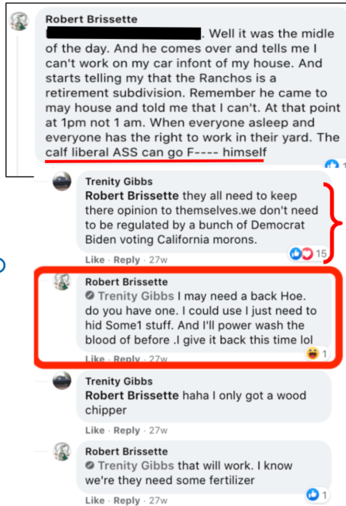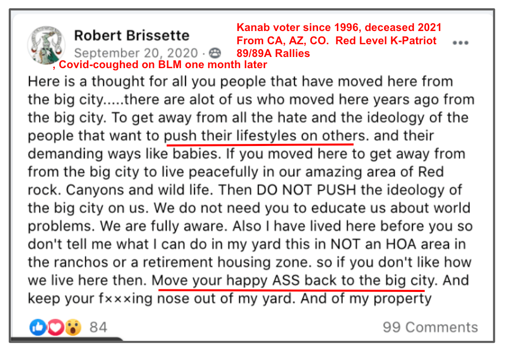 One month before Kanab Patriot Robert Brissette coughed on Black Lives Matter sign waivers (viral video), he posted “move your happy ASS back to the big city…” describing anger at liberal neighbors. Brissette posted thin on Kanab/Fredonia Rant & Rave despite violating group guidelines and including a backhoe murder discussion of liberals in the comments. The following April, Brissette was arrested for threatening perceived liberals on. a FB page “Say It Kanab! Free Speech for All” and a few months later killed in a personal altercation.