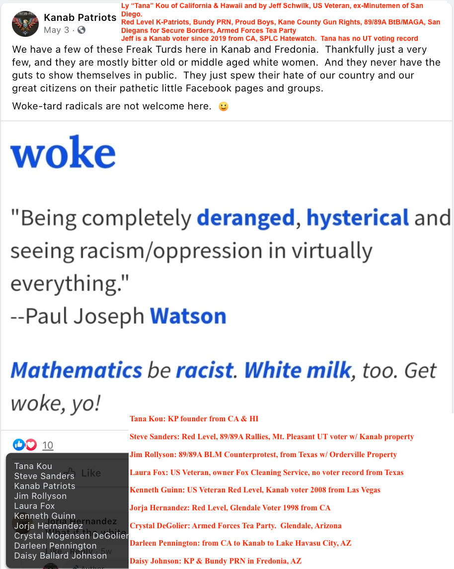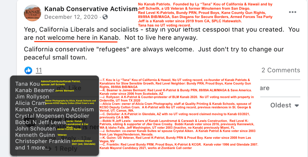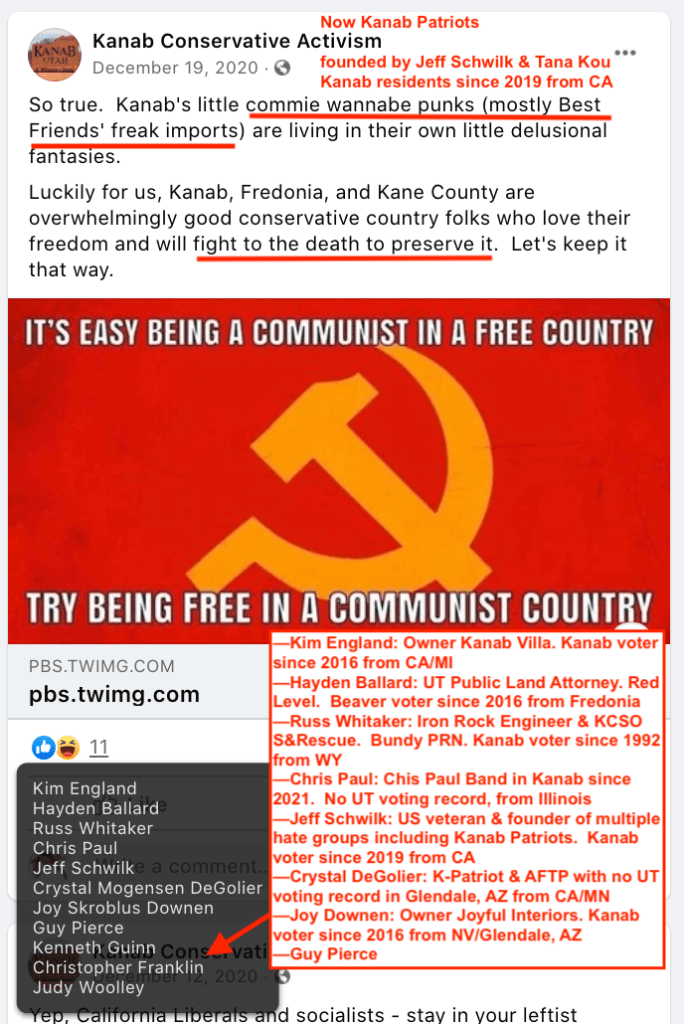 | Business Owners Kim England: Owner Kanab Villa. K-Patriot & KC Gun Rights. Kanab voter since 2016 from CA & MI Chris Paul: The Chris Paul Band in Kanab since 2021. A K-Patriot with No Utah voting record, from Illinois. Joy Downen: Joyful Interiors. A K-Patriot since KSSG. Kanab Voter since 2016 from NV/AZ/UT Laura Fox: owner Fox Cleaning, US Veteran, K-Patriot & KC Gun Rights Group. No Utah Voting record, from TX. Ly Sit “Tana” Kou, co-founder Kanab Patriots. Red Level Bundy PRN, Proud Boys, KC Gun Rights, Counter-protest Kanab’s March for George Floyd, 89/89A Rallies & Trump Cruise. NoBama & Build the Wall activist. No UT voting record from Hawaii & CA (2018) Public staff & candidates Hayden Ballard: J6 supporter. Red Level K-Patriot. Legal Counsel Utah Public Lands Policy, Ozark Hills Insurance. A K-Patriot & Beaver, UT Voter since 2016 from Fredonia, AZ Christopher Franklin: Red Level Bundy PRN, Proud Boys, K-Patriot & KC-Gun Rights. Zionbank Callcenter staff. Kanab voter since 1996 Mayoral Candidacy 2021, from Glendale, UT. Judy Woolley: A K-Patriot with no UT voting record. Candidate 2021 Kanab City Council & 2016 Montana Commissioner w/ spouse for MT State Rep. From MT/TX/MI/MO | Veterans Jeff Schwilk: Red Level Veteran, founder of K-Patriots, SoCal Patriot Coalition, Armed Forces Tea Party, San Diegans for Secure Borders, Americans for Secure Borders, San Diego Minutemen Leader. Bundy PRN, KCGR, Proud Boys, Stand with Utah Against Illegal Immigrants. Kanab Voter since 2019 from California. Guy Pierce Kenneth Guinn: Red Level Veteran, K-Patriot, Bundy PRN, Proud Boys, KCGR, Kanab Voter 2008 Active from Las Vegas Clifford Smart: Red Level Veteran & Pastor at Trinity Church AGod in Fredonia. A K-Patriot & Bundy PRN. Kanab voter since 2014 from CA/TX Deborah Peterson: A K-Patriot & J6 supporter. Kanab voter since 2020 from CA/AR. Law Enforcement & Staff/Volunteers Russ Whitaker: KCSO Search & Rescue, Iron Rock Engineer. K-Patriot & Bundy PRN. Kanab Voter 1992 from WY | Residents Terry Beardall: Red Level K-Patriot, Q’Anon & Moutsos. Glendale Voter 1999 Active. Kanab Beamer is James Bermant: Red Level K-Patriot, Bundy PRM, 89/89A ALM & MAGA Ralliees, KFRR, Kanab Voter 2006 Active from Scottsdale/Mesa AZ Daisy Ballard Johnson: Bundy PRN, K-Patriot, KC-Gun Rights. No UT voting record, Fredonia AZ Dusti Dallas Hutchings: A K-Patriot & BFAS staff with no UT voting record from San Diego area. Grace Ann Christian is Lois Corson: Red Level QAnon, Bundy PRM, Patriot Prayer, Admin KC Patriot Group, 89/89A, K-Patriots, KCGR, Glendale Voter since 2003 from CA. Jorja Hernandez: Red Level K-Patriot, KC-Gun Rights. Glendale Voter since 1998, from CA. Jim Rollyson: Counter-protest Kanab’s March for George Floyd, A K-Patriot & Bundy PRN. No UT voting record, from Texas with property in Orderville & spouse at BFAS Non-residents Steve Sanders: Red Level Bundy PRN, K-Patriot, KC-Gun Rights, Proud Boys, 89/89A ALM/MAGA rallies. Mt. Pleasant Voter 1998 Active, property in Kanab. Aleasha Jones: A K-Patriot with no UT voting record, from UT/AZ Crystal DeGolier: K-Patriot in Glendale, AZ with no UT voting record. KC-Gun Rights & Schwilk’s AFTP. Darleen Pennington: A K-Patriot with no UT voting record. From CA in AZ, former Ranchos neighbor of Schwilk/Kou |