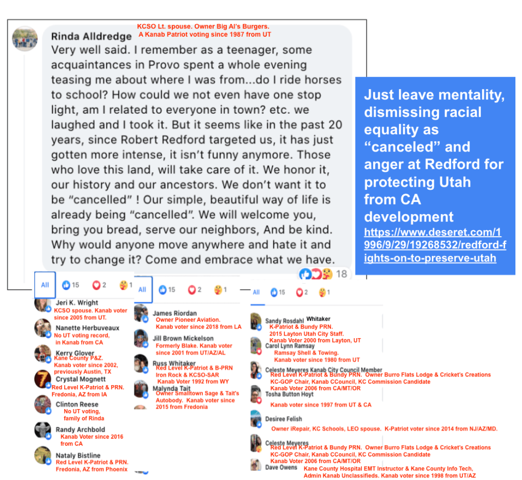 Before Rinda Alldredge commented on Celeste Meyeres’ post “Please, no more move-ins….Robert Redford targeted us” (in section above), she questioned the Democratic move-ins on Kanab/Fredonia Rant & Rave. Again, many Kanab Patriots supported this bigotry and added to it.