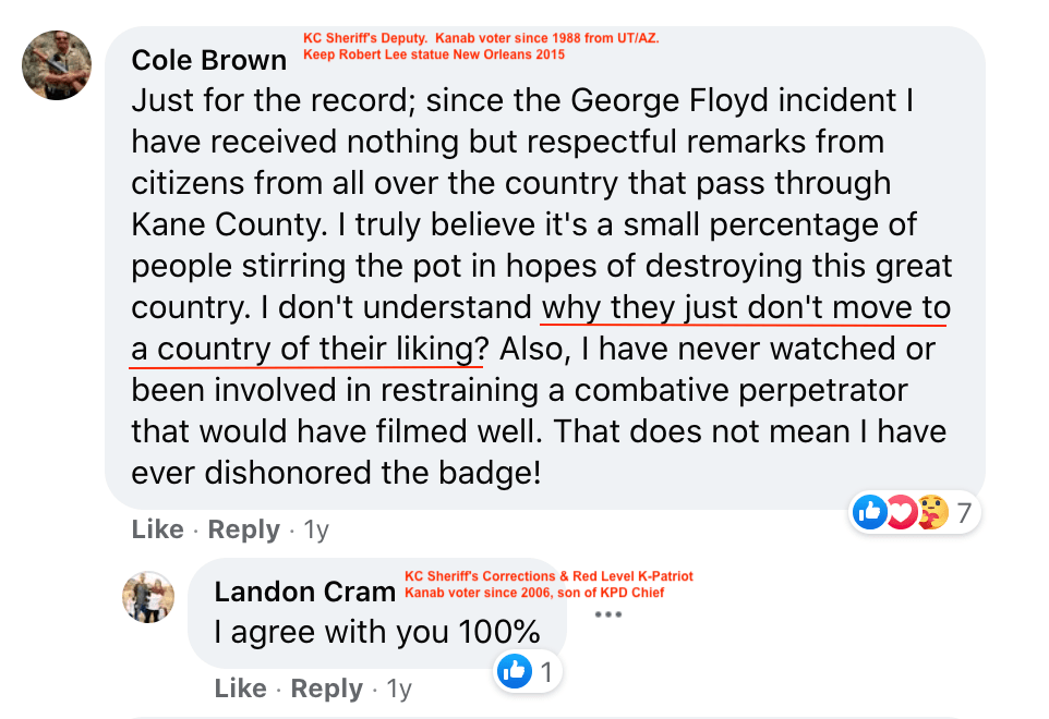 Kane County Sheriff’s Deputies Mark Cole Brown & Thomas Landon Cram also agree that people should just leave the country. Corrections Officer Landon Cram is the son of the Chief of the Kanab City Police Department, Tom Cram, and is a red level Kanab Patriot for extensive bigotry & extremism. In 2015 when the New Orleans City Council voted unanimously to remove a statue of Robert E Lee, Cole Brown changed his profile picture to a statue of & supportive story of Robert E Lee . In this post he describes the murder of George Floyd by Chauvin as “didn’t film well”.