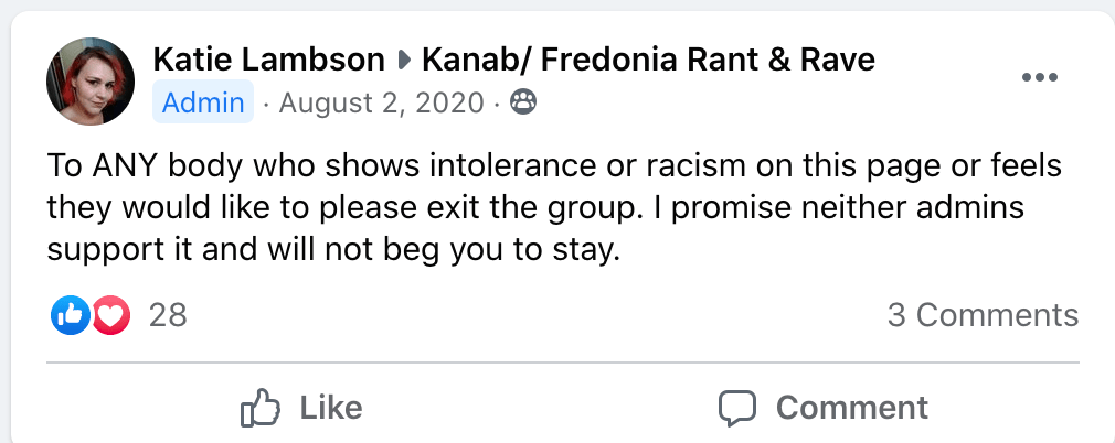 These platforms were exposed in previous KURW post Understanding Social Media in Kanab: Groups, Pages & Individuals and hate continues to be shared despite exposure by KURW & guideline reminders by page admin like the one to the right.