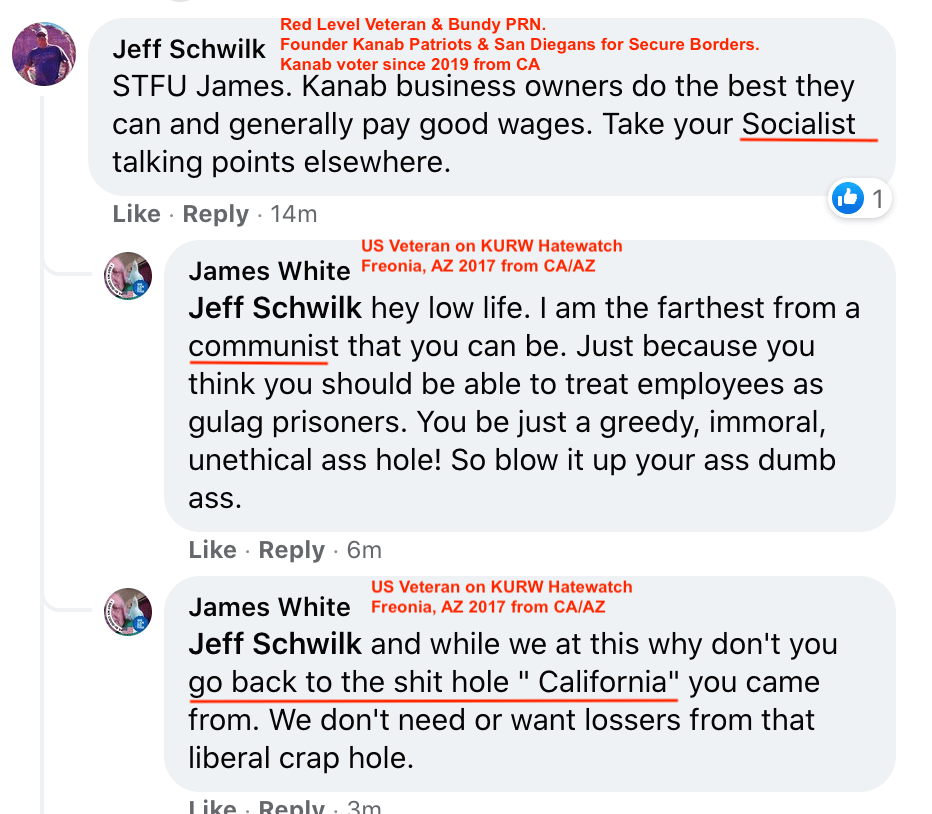 In a turn of events two US veterans, both former California residents & both on KURW Hatewatch engage in a hateful encounter of “just leave” on Kanab/Fredonia Rant & Rave group. James White tells Jeff Schwilk to “go back to the shit hole CA…” Jeff Schwilk is the founder of Kanab Patriots and his post immediately above this one Schwilk tells California liberals to “stay in the leftist cesspool you created…” Both are US Veterans from California and recent move-ins who don’t want California move-ins.