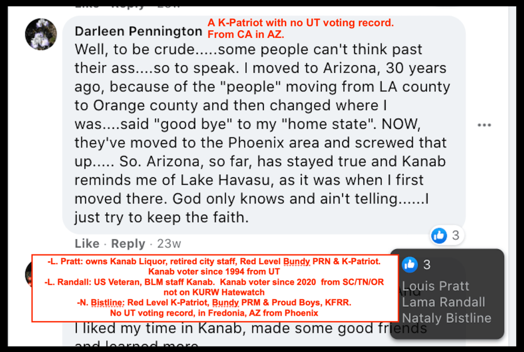 | Ruby Johnson owns Mamas Herbal Salvation Kanab voter 2012 from UT/ND/MN Not on Hatewatch Cindy Aiken Owns Duke’s Clothing. Kanab voter since 1984 from UT/NV/NY. Insufficient for KURW Hatewatch Larry Rose owns Larry Rose Construction. Kane voter since 1983 with other Utah residences. Sarah Sanders Lofing owns The Shabby Iris Cottage Cakery. A Kanab Patriot & veteran spouse. Kane voter since 2016 with previous residences in NV/NM/AZ Jim Anderson Tour Guide, Kanab Voter since 2006 from UT. KURW Hatewatch Celeste Meyeres Crickets Creations & Burro Flats Lodge, Support J6ers Crosby & Trump. Chair KC-GOP, KC Commissioner 2023, Kanab City Council 2016-22. A K-Patriot & Bundy PRN, Kanab Voter since 2006 from CA/OR/MT. Red level KURW Hatewatch Trenity Gibbs Kanab Sinclair No UT voting record, Fredonia from AZ. Owns Kanab Sinclair. Travis Franklin Sugar Knoll Construction Kane voter since 1994 from Orderville, UT Aaron Cotter Kid’s Corner Organix & duplex rental. A K-Patriot with no UT voting records in Kanab from UT/KY. Becky Clark Prineville Produce in Oregon, Not on KURW Hatewatch. Casey Cox: Let’s Do This, K-Patriot, See My Smile, No Voter Record Utah son of Donald & Shawna Cox of Bundy PRN. Louis Pratt: Kanab Package Liquors & retired city staff. A red level K-Patriot & Bundy PRN. Kanab voter since 1994 from UT. Alan Seilhammer: A&A Hard Earned Honey, Freelance Finance & Banking. Multi-state Gun Groups, K-Patriots, K/F-R&R. K-Farmer’s Market. No Utah Voting Records. From Connecticut. | ELECTED OFFICIALS Celeste Meyeres Chair KC-GOP, KC Commissioner 2023, Kanab City Council 2016-22. Crickets Creations & Burro Flats Lodge, Support J6ers Crosby & Trump, K-Patriots & Bundy PRN. Kanab Voter since 2006 from CA/OR/MT. Red level KURW Hatewatch Ray Clark Garkane Energy Board (Kanab City Limit). Kanab voter since 1980 from UT/NV Jeremy Trebas Montana State Representative. A K-Patriot, Celeste Meyeres & KC-Gun Rights. No UT voting record from MT/IL/CA. Property in Kane County. Red Level KURW Hatewatch SCHOOL STAFF Jeannine Peterson KC-Schools Staff (former). Kanab voter since 1986 from TX/KS. Support J6er Vetere. GOVT STAFF Celeste Mognett Cram Kanab City Staff & Younique Beauty, K-Patriot, KFRR, Stand for Freedom UT. NO Kanab Voter Record from AZ/UT/OH. KPD Chief Cram is father-in-law. Louis Pratt: owner Kanab Package Liquors & retired city staff. A red level K-Patriot & Bundy PRN. Kanab voter since 1994 from UT. | Darren Gifford US Army Reserve. In CA from Kanab. Not on Hatewatch Allen Chubbs Veteran in NV/CA. Insufficient for KURW Hatewatch Marson Keller Veteran, K-Patriot, Kane County Sheriff’s Retired, Gold Ambassador for Plexus Worldwide Kanab Voter 1999 from UT Stephen Barneby Jarbridge VFD, US Veteran, K-Patriot w/ no UT voting record from NV/PA/VA/NY. Not on Hatewatch Russ Whitaker: KCSO Search & Rescue, Iron Rock Engineer. K-Patriot & Bundy PRM. Kanab Voter 1992 from WY Cameron Noel Sheriff Beaver County Utah. Beaver voter since 2002 from UT/NV. Son of Mike Noel. KURW Hatewatch Kym Cloughesy Long Beach PD staff (retired), Best Friends Animal Society (resigned 2020), Counter-protest Kanab’s March for George Floyd. Red Level K-Patriot, Proud Boys with no UT voting record now in Prescott, AZ James White US Veteran in Fredonia, AZ from CA/AZ 2017. Founder of Motorized Bicycles of Surprise, AZ. Jeff Schwilk: Red Level Veteran, founder of K-Patriots, SoCal Patriot Coalition, Armed Forces Tea Party, San Diegans for Secure Borders, Americans for Secure Borders, San Diego Minutemen Leader. Member/supporter: Bundy PRM, KCGR, Proud Boys, Stand with Utah Against Illegal Immigrants. Kanab Voter since 2019 from California. SPOUSES/PARTNERS Ly Sit “Tana” Kou, co-founder Kanab Patriots. Red Level Bundy PRN, Proud Boys, KC Gun Rights, Counter-protest Kanab’s March for George Floyd, 89/89A Rallies & Trump Cruise. NoBama & Build the Wall activist. No UT voting record from Hawaii & CA (2018) Sarah Sanders Lofing owns The Shabby Iris Cottage Cakery. A Kanab Patriot & veteran spouse. Kane voter since 2016 with previous residences in NV/NM/AZ |