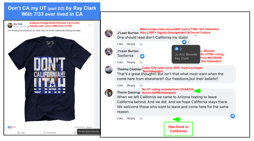 Occasionally, Conservative CA move-ins speak up against the bigotry as seen here by Linda Chickering. In this comment she pleas with others “stop being so judgmental”. Chickering has no UT voting record (spouse Kanab voter since 2020).