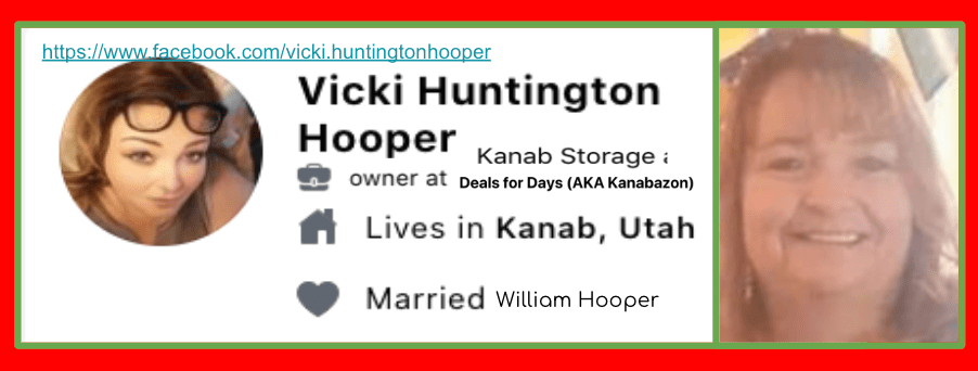 Vicki Hooper’s online activity is designated Red Level for depth and breadth of extremism, disinformation, conspiracy & bigotry. She owns/operates Kanab Storage & Deals for Days (Kanabazon) & was staff at Kane County Office of Tourism. Kanab Voter since 2018 from UT.