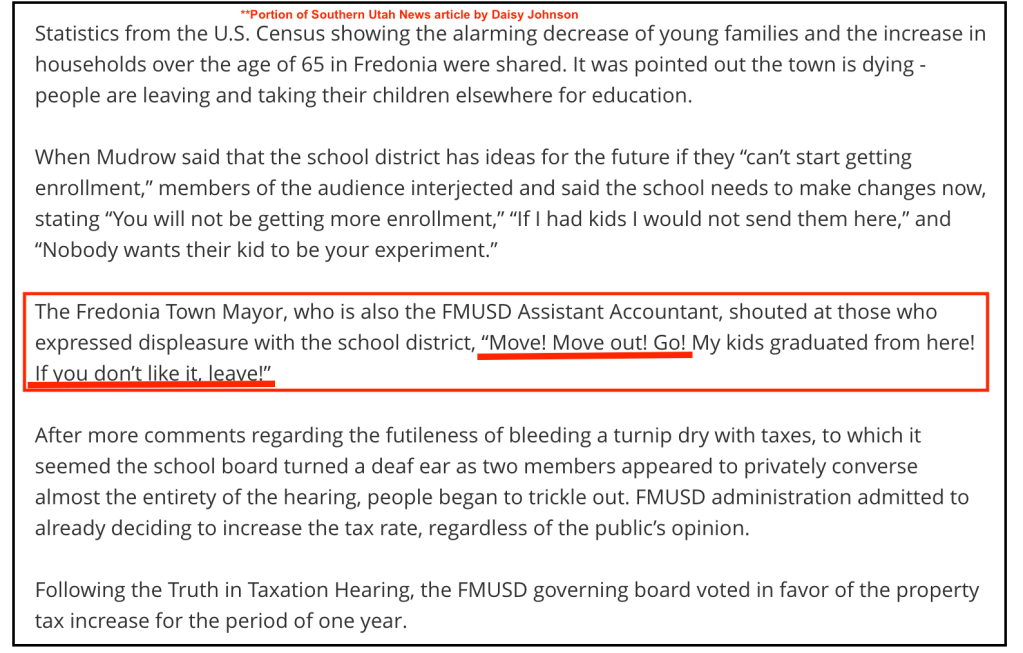 The Mayor of neighboring Fredonia, AZ, Kimberly Honey Purvis, replied ““Move! Move out! Go! My kids graduated from here! If you don’t like it, leave!” to resident(s) voicing concern at a Fredonia School Board meeting to raise property taxes. This was reported in the Southern Utah News by writer Daisy Johnson. The screenshot below is from that article, see full article here.