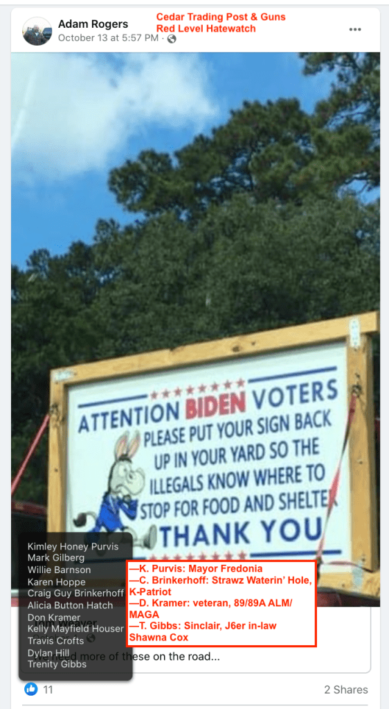 Mayor Purvis is on KURW Hatewatch for her public on-line engagement in extremism & bigotry including: FBI involvement in J6 Insurrection, blame media & Democrats as real culprits of J6 for pushing conservatives to the brink, Democrat concern for J6 police officers is B.S. because they knelt for death of Floyd, if you hate America then vote Democrat, conspiracy & divisiveness following murder of George Floyd (demean funeral, ridicule family emotion, disparage displays of solidarity & compassion, Democrats value life of Floyd above all others, criminalize victim), approving 2A Sanctuary Resolution in Fredonia, dismissing bigotry with “I will not apologize for being white, Christian, supporting cops…”, false dichotomy of deaths from mass shooting weapons vs hospital errors & FDA approved drugs, and Biden voters should put their signs back in yard so “illegals” know where to go for food & shelter. Here’s a collection of her engagement