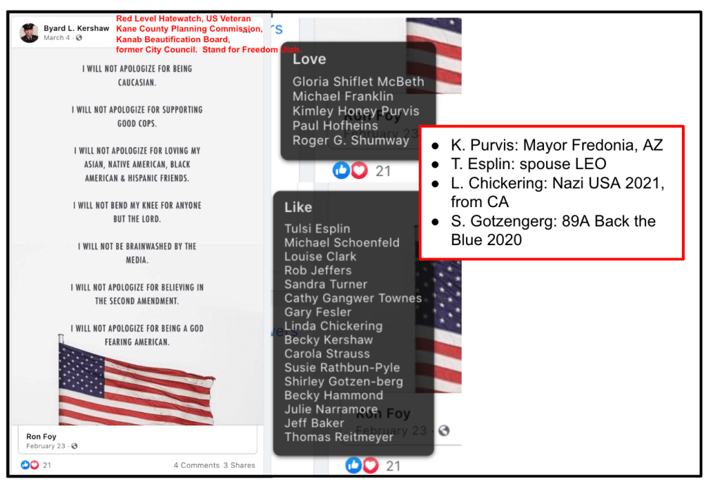 | Business Owners & Public Officials/Staff supporting bigotry by Kanab Patriots | Veterans & Law Enforcement supporting bigotry by Kanab Patriots | Public Staff & Non-residents supporting bigotry by Kanab Patriots |